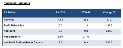 GEM COMM: Alliance Healthcare (MIJ) announced FY2020 net profit attributable to shareholders increased to S$2.3 million on revenue of S$42.8 million