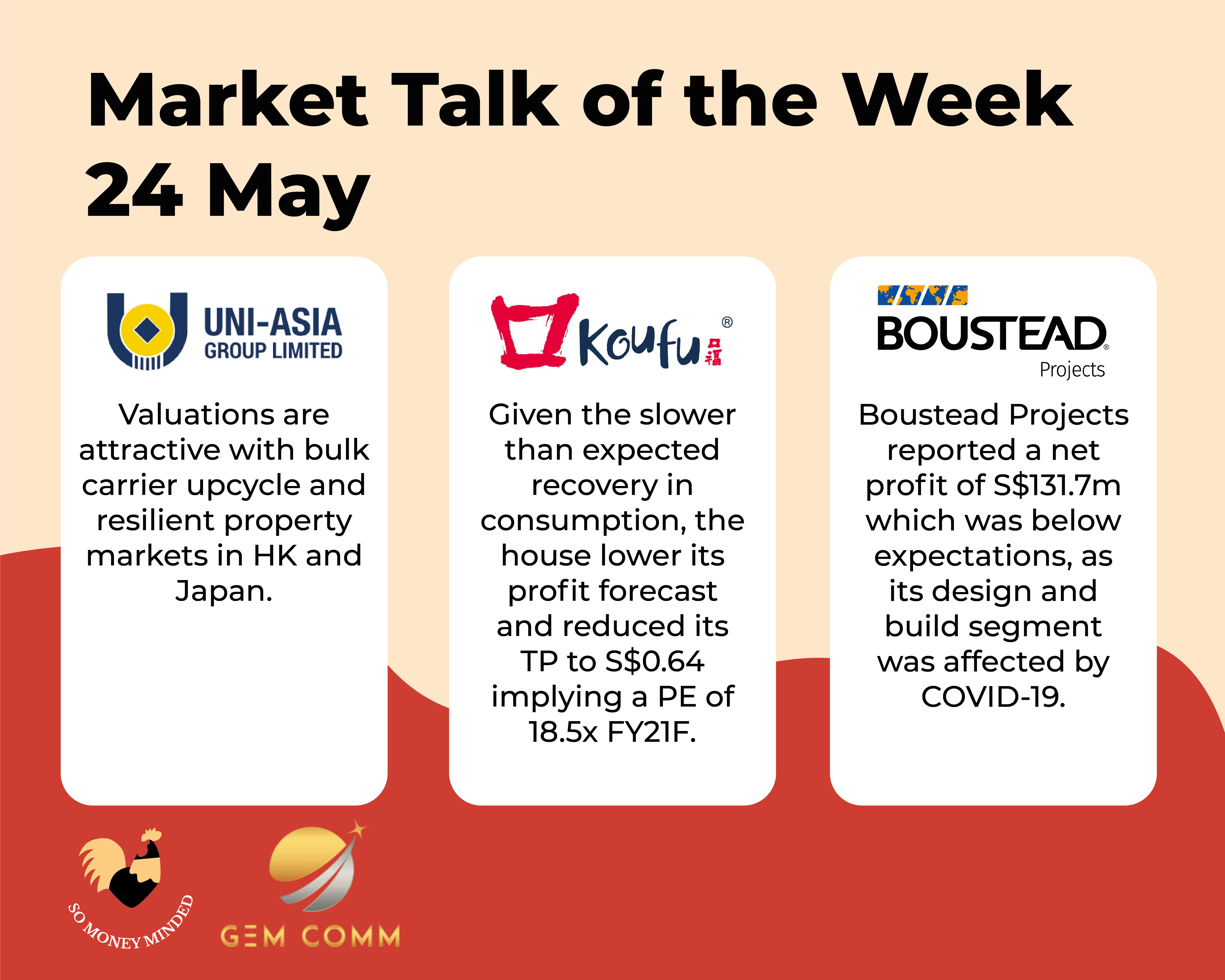 • KGI; Joel Ng: Upgrade to Outperform with TP S$0.91. Valuations are attractive with bulk carrier upcycle and resilient property markets in HK and Japan. The House raises its multiples for shipping division from 0.2x to 0.5x P/B while maintaining 0.5x P/B for its HK and Japan property business. Forecast dividend of 3-3.5 S Cents on 40-48% payout ratio to give an implied dividend yield of 5%.