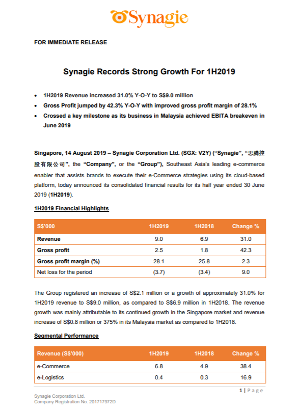Synagie Corporation Ltd. (SGX: V2Y) (“Synagie”, “思腾控股有限公司”, the “Company”, or the “Group”), Southeast Asia’s leading e-commerce enabler that assists brands to execute their e-Commerce strategies using its cloud-based platform, today announced its consolidated financial results for its half year ended 30 June 2019 (1H2019).