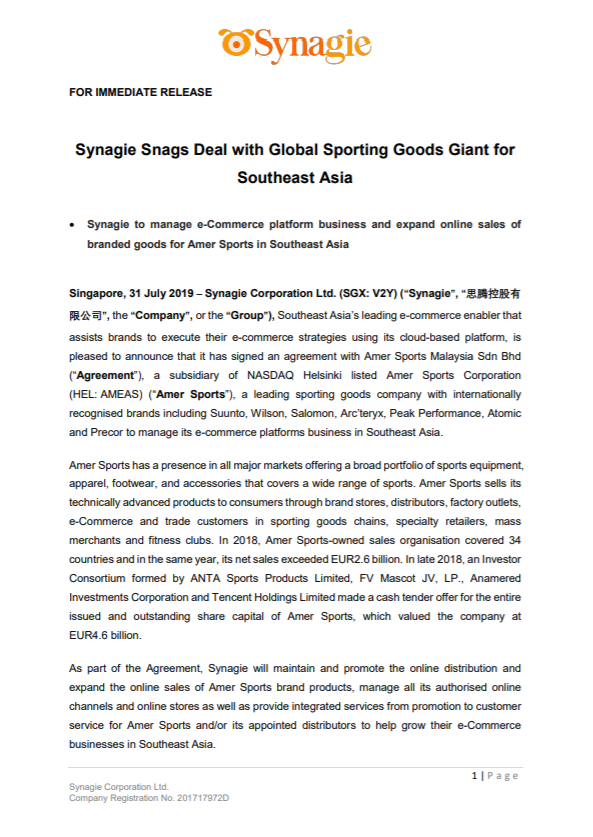 Synagie Corporation Ltd. (SGX: V2Y) (“Synagie”, “思腾控股有限公司”, the “Company”, or the “Group”), Southeast Asia’s leading e-commerce enabler that assists brands to execute their e-commerce strategies using its cloud-based platform, is pleased to announce that it has signed an agreement with Amer Sports Malaysia Sdn Bhd (“Agreement”), a subsidiary of NASDAQ Helsinki listed Amer Sports Corporation (HEL: AMEAS) (“Amer Sports”), a leading sporting goods company with internationally recognised brands including Suunto, Wilson, Salomon, Arc’teryx, Peak Performance, Atomic and Precor to manage its e-commerce platforms business in Southeast Asia.