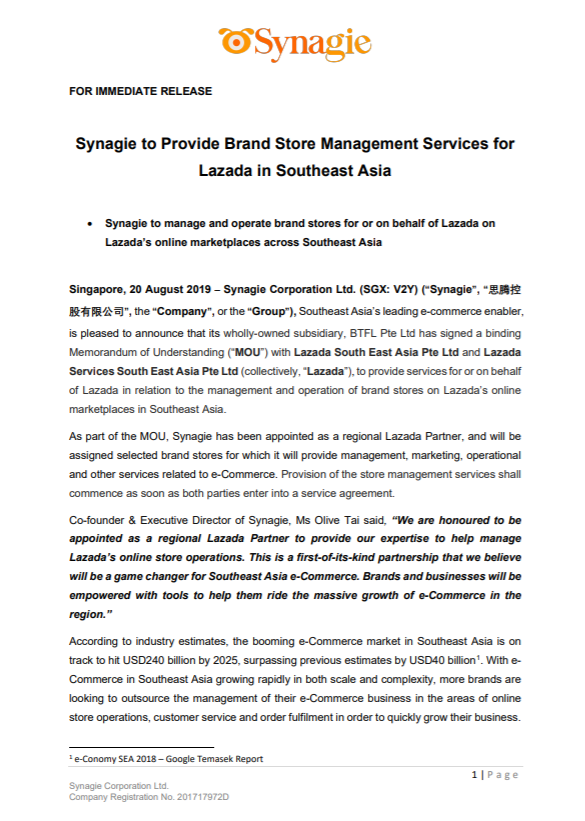 Singapore, 20 August 2019 – Synagie Corporation Ltd. (SGX: V2Y) (“Synagie”, “思腾控股有限公司”, the “Company”, or the “Group”), Southeast Asia’s leading e-commerce enabler, is pleased to announce that its wholly-owned subsidiary, BTFL Pte Ltd has signed a binding Memorandum of Understanding (“MOU”) with Lazada South East Asia Pte Ltd and Lazada Services South East Asia Pte Ltd (collectively, “Lazada”), to provide services for or on behalf of Lazada in relation to the management and operation of brand stores on Lazada’s online marketplaces in Southeast Asia.